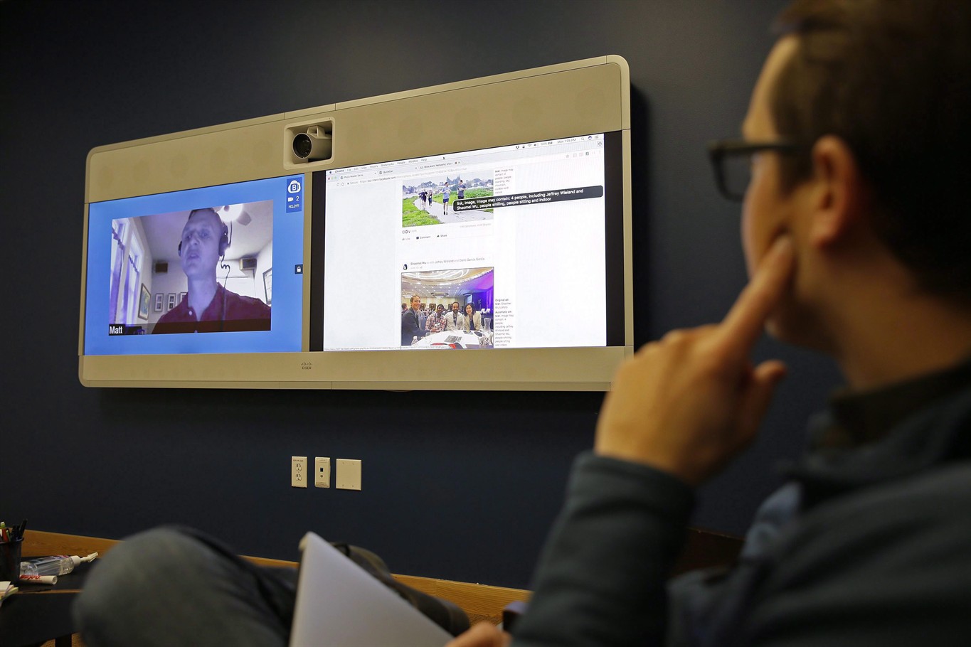Nesta foto tirada segunda-feira, 18 de dezembro de 2017, Jeff Wieland, à direita, diretor de acessibilidade do Facebook, observa o engenheiro Matt King, que é cego, demonstra a tecnologia de reconhecimento facial através de uma teleconferência na sede do Facebook em Menlo Park, Califórnia. Em anúncios recentes de pessoas como Facebook, Live Nation e uma força policial do Reino Unido, os canadenses podem precisar se acostumar com a ideia da tecnologia de reconhecimento facial permeando suas vidas cotidianas. A IMPRENSA CANADENSE / AP, Eric Risberg